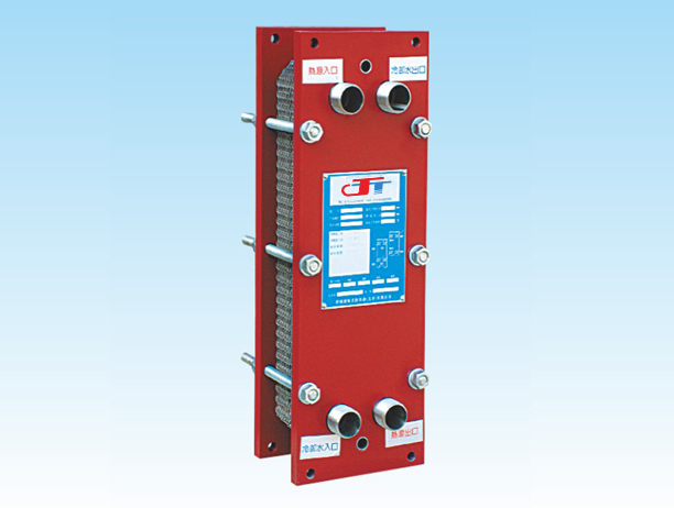 板式换热器是由框架、传热板片组及夹紧螺栓等主要部件组成。框架包括一个固定压紧板和一个活动压紧板,由上导杆与下导杆支承,在另端有一支柱。压制成的波纹板片悬挂在两板之间的上导杆上,移动活动压紧板将板片组压紧,再用一组夹紧螺柱将固定压紧板和活动压紧板夹紧至一定尺寸。两种介质经固定(或活动)压紧板上法兰孔流入由波纹板片组成的各自通道,热交换后介质再由固定(或活动)压紧板上的法兰孔流出。同定压紧板、活动压紧板、支柱及导杆均为低碳钢。考虑到用户的多种使用要求,框架设计有多种型式,主要有双支撑框架式和常用的落地式等,也可根据用户的要求更改框架的型式。
